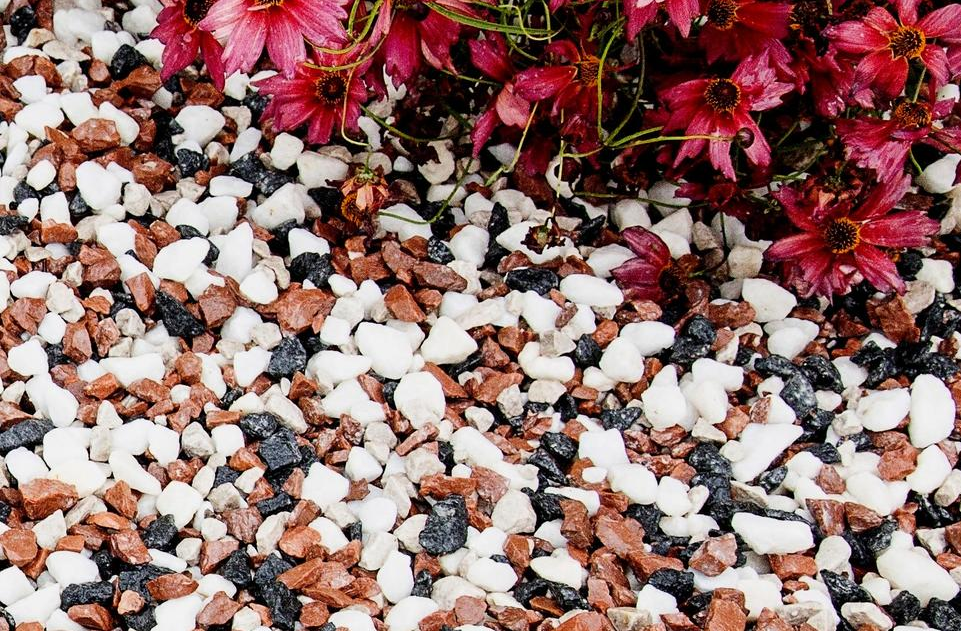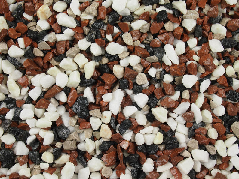A multi-coloured mix of red, black, white and grey stones. Very distinctive and contemporary. A blend of bright stones gives a different finish than normal gravel. Great for pathways and ground cover. Best to be laid at 3-4cm deep. The actual size ranges between 6-12mm.